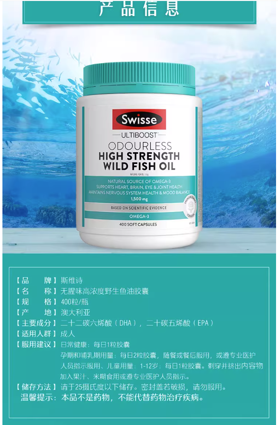 • 商品名称:Swisse odourless fish oil 1000mg 无腥鱼油 400 Capsules